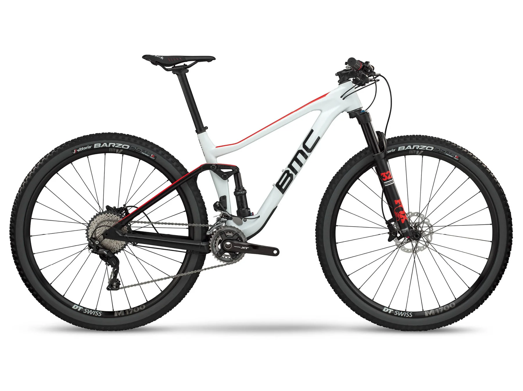 - Cockpit: BMC MSM stem and MFB 02 handlebar (750mm wide), Fizik Antares R7 saddle, and X-Fusion Manic dropper post.