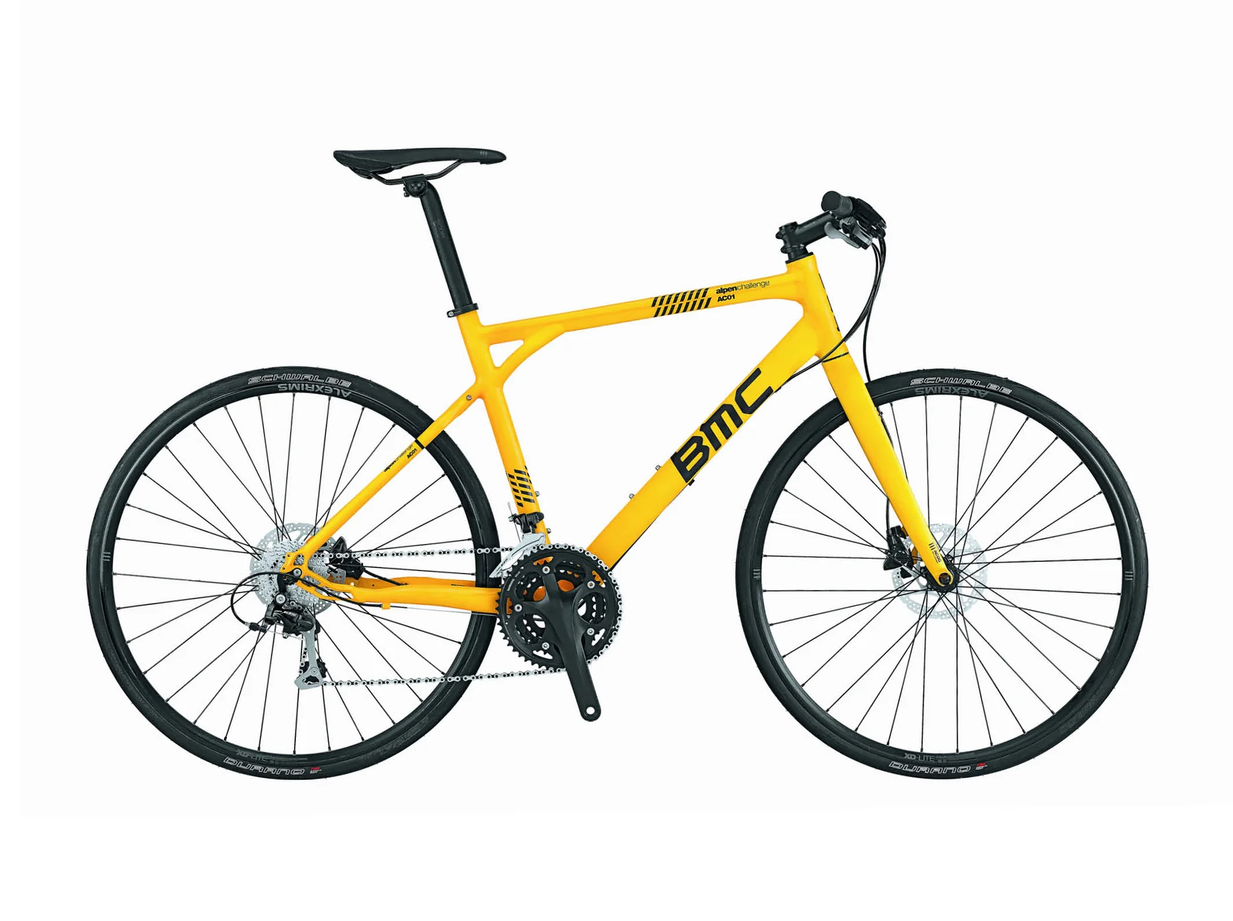 Wheels are built tough with Alex XD Lite rims and Shimano hubs, ready for daily abuse. The Schwalbe Durano tires are a commuter favorite: fast on tarmac, grippy in corners, and surprisingly durable. Many owners add fenders or racks easily, turning the Alpenchallenge AC01 105-Tiagra Yellow into a true all-weather workhorse.