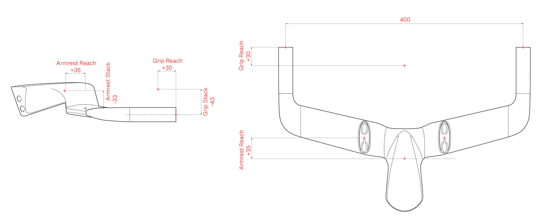 This cockpit base is particularly appealing for those transitioning from casual cycling to competitive events. By lowering the armrest stack by 33mm and extending the reach by 35mm compared to the original flat handlebar, it promotes a forward-leaning position that slices through the wind more effectively. The grip contact points are also optimized, with a reduced stack of 43mm and an added reach of 30mm, providing better control during intense efforts.