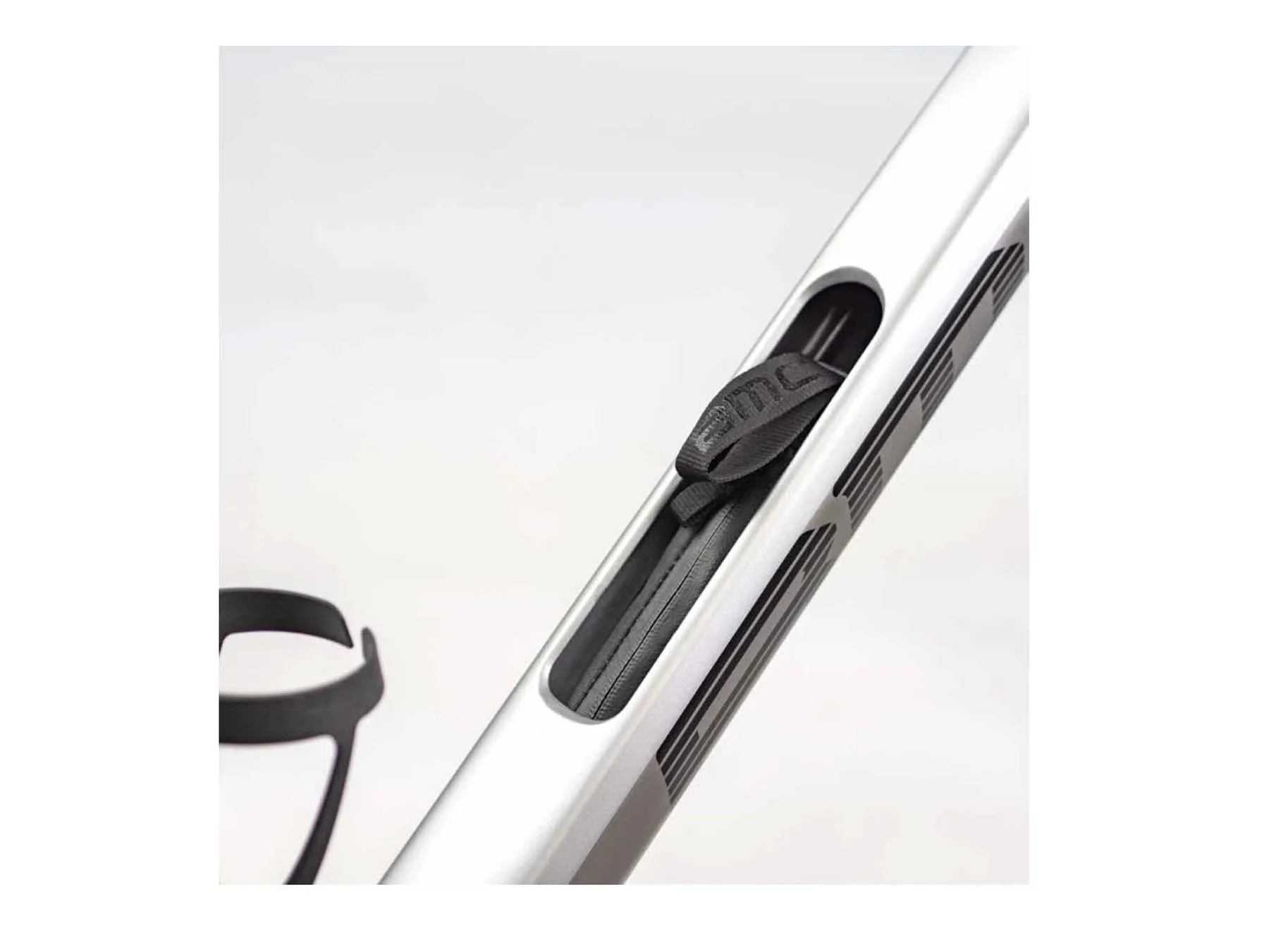 Some bikes, like those from ENVE or BMC, feature built-in down tube compartments. Complementary pouches, such as the ENVE Cargo Bay or BMC Storage Pouch, fit inside these, organizing tools and tubes with zippered pockets and pull tabs for easy retrieval.